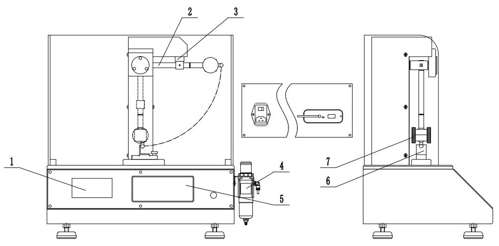 1-打印機 2-擺 3-鎖緊裝置 4-調壓閥 5-顯示屏 6-金屬平砧 7-配重塊