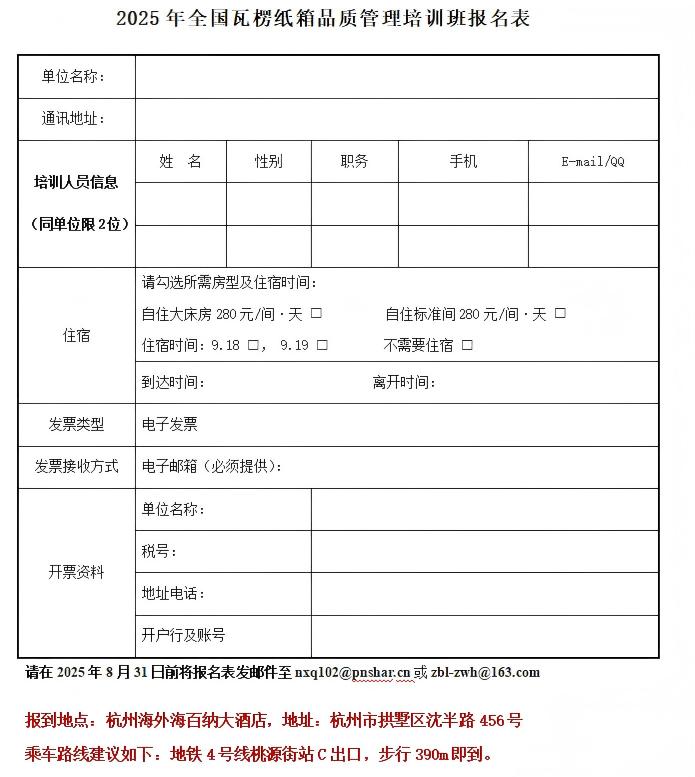 為了提高紙包裝行業的產品質量管理水平,幫助企業更好地適應紙包裝用戶對紙包材品質管控需求,進一步提高包裝生產、質檢、研發、質量監督檢測等崗位的技術業務能力,中國包裝聯合會紙制品包裝專業委員會聯合杭州品享科技有限公司、杭州衡正檢測技術有限公司,將于2025年9月18日—20日在浙江杭州舉辦“2025年全國瓦楞紙箱品質管理培訓班”,現將相關事項通知如下: